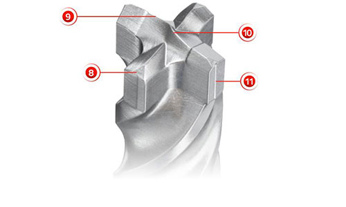 Der vierschneidiger Kopf des Bohrer SDS Quattric II bedingt vier Bohrwendel. Dadurch entsteht mehr Reibung und das Bohrmehl wird langsamer als bei einem zweiwendeligen Bohrer ausgeworfen. Wie beispielsweise beim SDS Bohrer Pointer Plus.