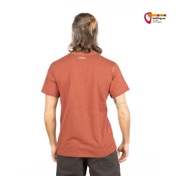 Modell mit ziegelrotem Chillaz E Ciao Herren Kletter T-Shirt von der Vorderseite.
