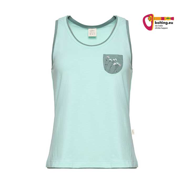 Modell mit Mint farbenem Chillaz Karpathos Flower Pocket Top von der Vorderseite.