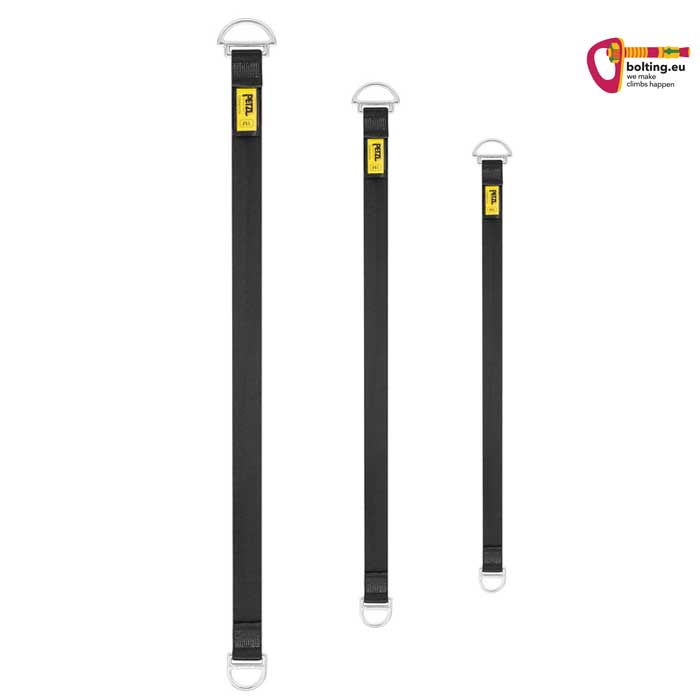 Drei schwarze Petzl Connexion Fixe Anschlagmittel nebeneinander.