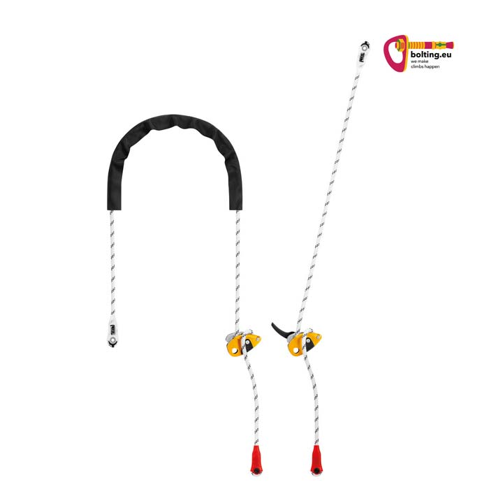 Petzl Grillon längenverstellbares Verbindungsmittel mit Seilstück, schwarzem Schutzschlauch und gelber Seilklemme vor weißem Hintergrund.