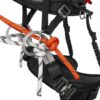 Erstens die Alu Schnellverschluss Schnallen. Zweitens die zwei unterschiedlich langen Seilbrücken. Drittens die vielen Material Befestigungspunkte bzw. deren variable Position. Abschließend garantieren vier kleine Stahl Ringe die Befestigung von schweren Werkzeugen wie z.B. einer Kettensäge.