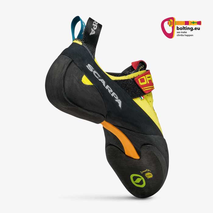 Gelb schwarzer Scarpa Drago Kletterschuh von der Seite mit Markenname und Velcro.