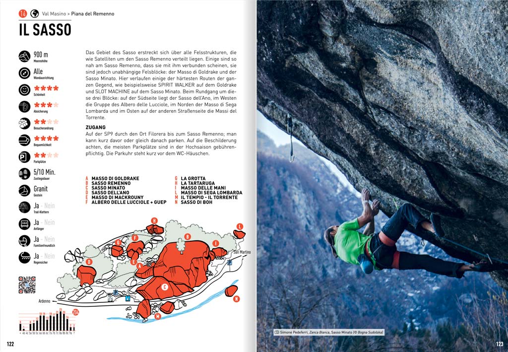Uns gefällt der Aufbau des Bergell Kletterführers. Denn es sind sowohl die Gebietsbeschreibung, Anfahrtsskizzen und Massiv Übersichten sehr gut und sauber gestaltet.